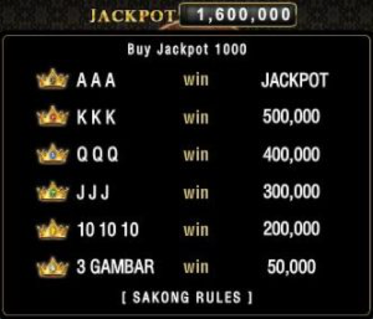 Jika anda akan mendapatkan 3 kartu AS maka anda akan mendapatkan jackpot yang ada pada meja permainan room pilihan anda. Jika anda bermain sebagai player maka anda akan mendapatkan bayaran 3 kali lipat dari bandar dan jika anda adalah seorang bandar maka dipastikan anda akan memakan semua taruhan yang dipasang oleh para player karena kartu anda adalah kartu tertinggi nomor 1 dalam permainan sakong.